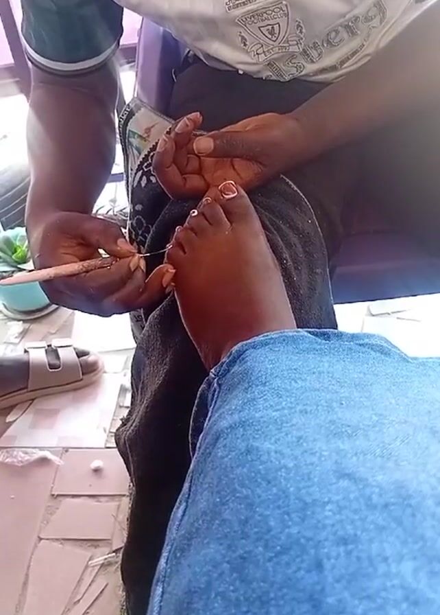 In a medium shot, a person is giving a pedicure to another person. The manicurist is a dark-skinned man, wearing a white t-shirt with an Adidas logo, black pants, and seated on a purple chair. He is bent over, carefully working on the toes of a dark-skinned woman who is wearing blue jeans. The woman's foot rests on the manicurist's lap. He is holding a thin, wooden tool in his right hand, and her foot with his left hand. The woman's toenails are painted with a coral color. In the background, there is a pair of brown sandals, a small green potted plant, and various pieces of cardboard scattered on the tiled floor. Natural light is streaming in, causing a glare on the t-shirt.