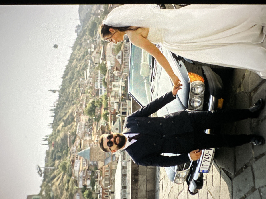 The image depicts two individuals, a man and a woman, dressed in wedding attire, posing outdoors in Tbilisi, Georgia. The man, positioned on the left, has a dark beard, wears sunglasses, and is clad in a dark double-breasted suit with a white shirt and dark tie. He smiles directly forward while holding the woman's right hand with his left. The woman, on the right, is in profile, looking towards the man. She wears a white strapless wedding gown and a white veil extending down her back. Her right hand holds the man's left. Between the couple is a vintage black Mercedes-Benz convertible with its top down, revealing a light-colored interior. The vehicle displays a Georgian license plate, "IT-749-1". The scene is set on a paved surface, likely cobblestones, with a low stone wall visible behind the couple. In the background, a densely built-up cityscape of Tbilisi cascades down a prominent hillside under a clear sky. Visible urban features include multi-story buildings with various architectural styles, one with a distinctive conical roof, and a cable car system with a suspended gondola in the upper right.