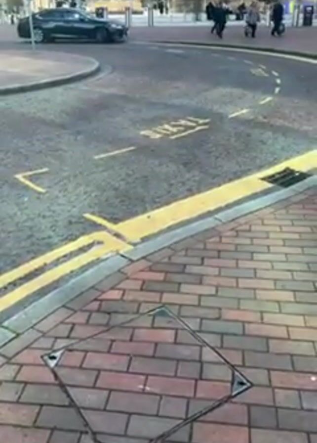 The camera pans up from a manhole cover in the pavement to reveal a street scene with a taxi lane marked on the road. A black car drives through the roundabout while several pedestrians walk by. In the background is a tall building with the words "VIRGIN ACTIVE HEALTH CLUB" displayed on it. There is also a circular building to the left of the frame. The sky is clear and blue.