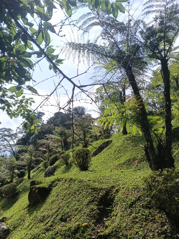 The image displays a sunlit, verdant hillside in Baglung, Nepal. A bright sky with minimal cloud cover is visible at the top, partially framed by dark, bare tree branches and green leaves in the immediate foreground, particularly on the left. The terrain consists of a steep, undulating slope covered uniformly with dense, short green ground vegetation, indicative of grass or creepers. Multiple tree ferns with dark, textured trunks and large, bright green fronds are prominent across the slope, with several rising vertically on the right side. Scattered smaller bushes and exposed rocks, some appearing moss-covered, are embedded within the green hillside. In the background, the slope continues upwards, densely forested with various tree species and additional tree ferns. Sunlight illuminates the scene from the upper left, highlighting the foliage. No people, animals, or man-made structures are present.