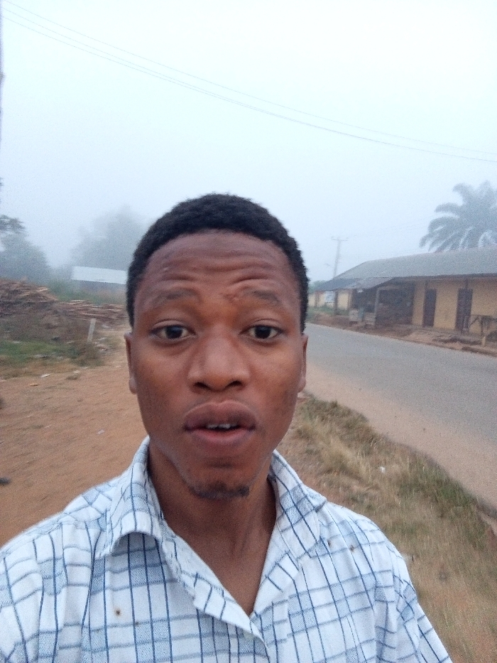 The image displays an adult male, with dark skin, short black hair, and a goatee, captured in a close-up, selfie-style shot. His mouth is slightly open, and his eyes are directed at the camera. He is wearing a white collared long-sleeved shirt with a blue grid pattern, exhibiting a small dark stain on the front center. The scene is located in Aramoko-Ekiti, Nigeria, and is characterized by a pervasive, dense atmospheric haze that significantly reduces visibility. In the background to the male's left, the ground is unpaved reddish-brown dirt, with a visible pile of cut timber or branches. Further into the distance on the left, obscured by the haze, are trees and a structure with a light-colored roof. To the male's right and extending into the background, a paved road with no discernible markings runs alongside a dirt and sparse grass verge. Beyond the verge, a series of single-story buildings with yellow-painted walls and dark, possibly corrugated metal, roofs are visible. A utility pole with overhead wires is situated on the right side of the road, and a palm tree is faintly visible in the far right background, further diminished by the atmospheric conditions.