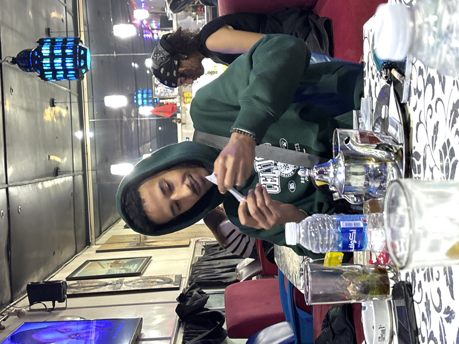 Two individuals are visible in an indoor setting. The first, wearing a dark green hooded sweatshirt, is seated at a table and appears to be rolling something, possibly a cigarette. A water bottle and a silver teapot are nearby. The second individual stands behind, wearing a black shirt and a bandana. The background features a wall with framed artwork, a television screen, and hanging blue lamps. The table is covered with a patterned tablecloth and various glassware.