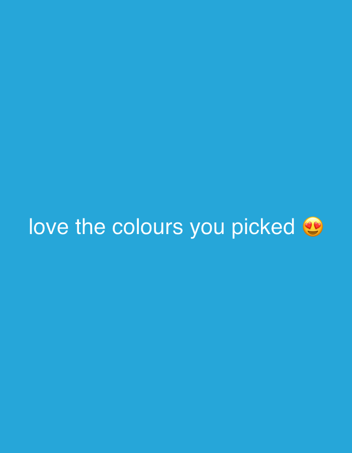 The image displays a solid, uniform blue background. Centered horizontally on this background, white sans-serif text reads "love the colours you picked". Immediately following the text is a yellow emoji depicting a smiling face with heart-shaped eyes. No other subjects, individuals, objects, actions, interactions, or discernible environmental features are present in the scene. Visual information to identify a specific location within Paris, France, is not contained within the depicted image.