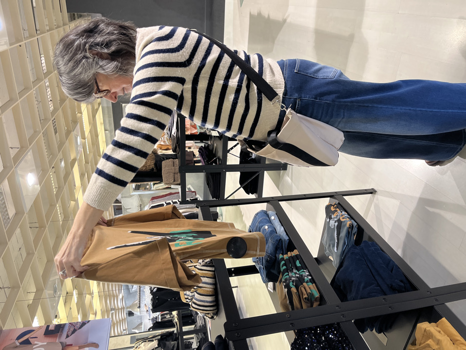 An adult female is depicted standing in a clothing store in Andrézieux-Bouthéon, France, examining a garment