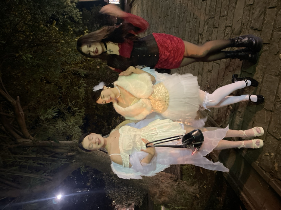 The image depicts three young adult females posing at night on a paved surface in Budva, Montenegro, against a background of dark, dense foliage and tree trunks, illuminated by artificial light sources. From left to right: 1. A female subject with dark hair, styled down, wears a white off-shoulder mini-dress with a visible corset-style bodice, translucent white fabric sleeves and a flowy skirt, and a large pair of white angel wings. She has her eyes closed and a slight smile. She wears white platform sandals with ankle ties and holds a black handbag with a small red devil-horned charm in her left hand. 2. A female subject with dark hair, styled back with a white feather ornament, wears a white tiered ruffled mini-skirt, a gold-patterned corset, and a white faux-fur shrug. She has her eyes closed and a slight smile. She wears white thigh-high stockings with white lace garters and black Mary Jane-style platform shoes. Her left arm is resting across the third subject's shoulder. 3. A female subject with long dark hair wears a dark red off-shoulder top with wide sleeves, a black underbust corset, and a dark red ruched mini-skirt. She wears black sheer tights, black platform combat boots, and a black choker with a silver cross pendant. She has an open-mouthed smile, and her left arm is raised and appears blurred from motion. The ground is composed of dark, irregularly shaped cobblestone or paving stones. Overhead, tree branches and leaves are visible against the dark night sky.