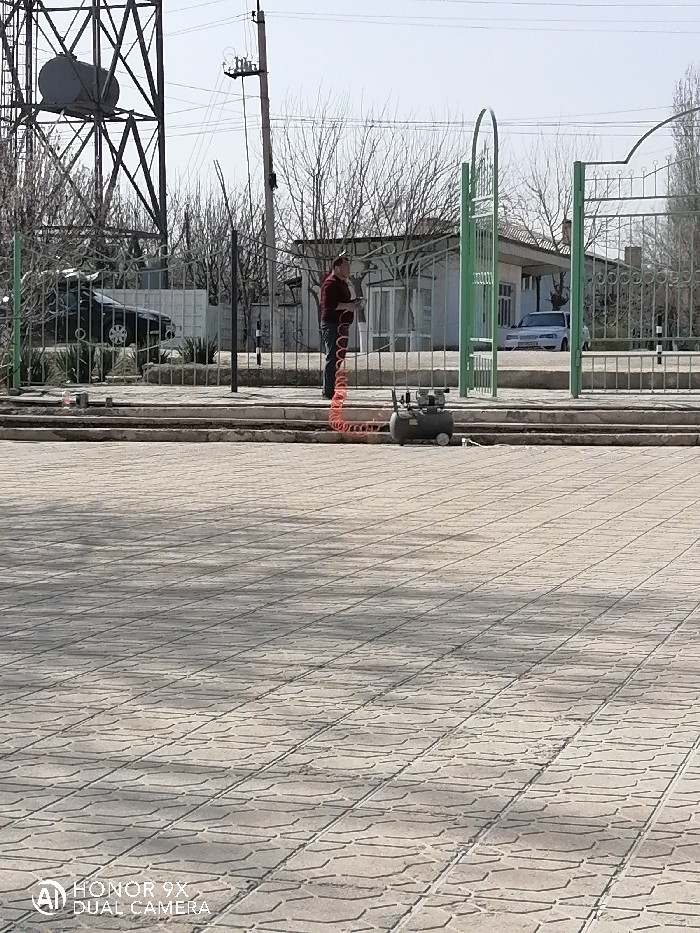 This image depicts an outdoor scene in the city of Samarkand, Uzbekistan, under clear skies with visible shadows. The foreground is paved with light-colored, rectangular interlocking pavers. A low concrete curb or step separates this pavement from a narrow concrete strip. On this strip, a small, gray portable air compressor with a coiled red hose is positioned. Behind the compressor, a light green metal fence, partially open with an arched gate, divides the scene. A male individual, dressed in a dark red long-sleeved shirt and dark pants, stands behind this fence, holding an object connected to the red hose. In the background, beyond the fence, a black sedan is partially visible to the left. To the right, a white building with windows and a white sedan parked in front of it are visible. The background also features numerous bare deciduous trees, utility poles with power lines, and a tall metal structure, possibly a water tower or cellular tower, with a dark tank at its apex on the far left.