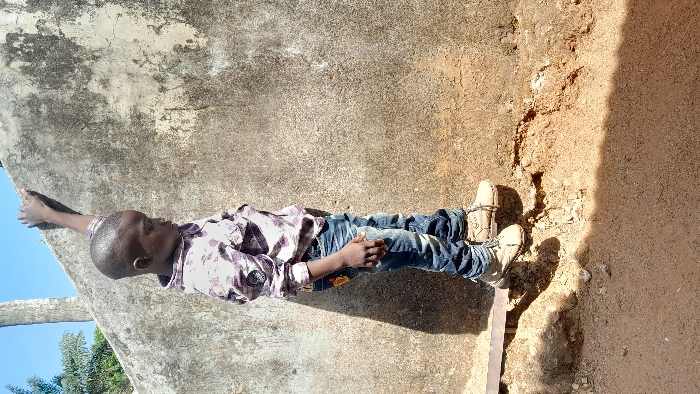 An image captures a young male subject, estimated to be between 6 and 10 years old, standing outdoors in Akwanga, Nigeria