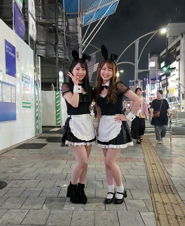 - "The image depicts two young East Asian females, dressed in matching black and white bunny maid costumes, posing on a paved city sidewalk at night in Shinjuku, Japan" by FM-g4ca33, licensed under CC BY 4.0