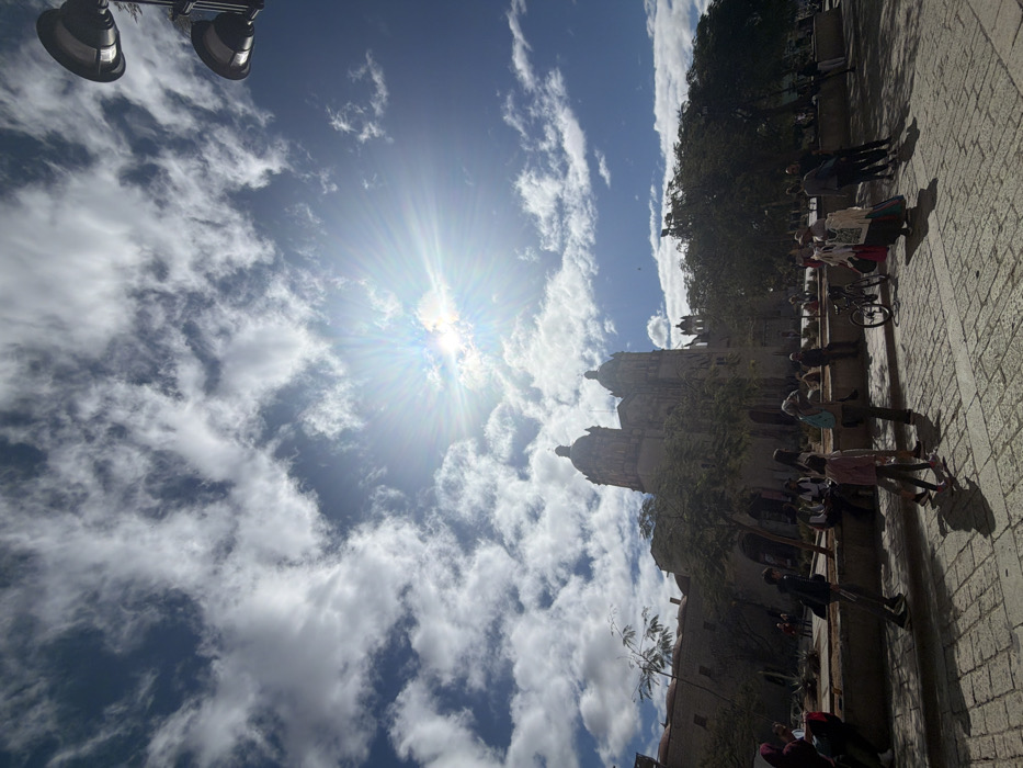 The image captures a bright, sunny day with scattered clouds. The sun is positioned prominently, radiating light across the sky. The silhouette of a building or cathedral with towers is visible, adjacent to a cobblestone street and sidewalk lined with trees and pedestrians. A street lamp is on the left. The image is likely taken from a low angle, emphasizing the sky and the height of the building.