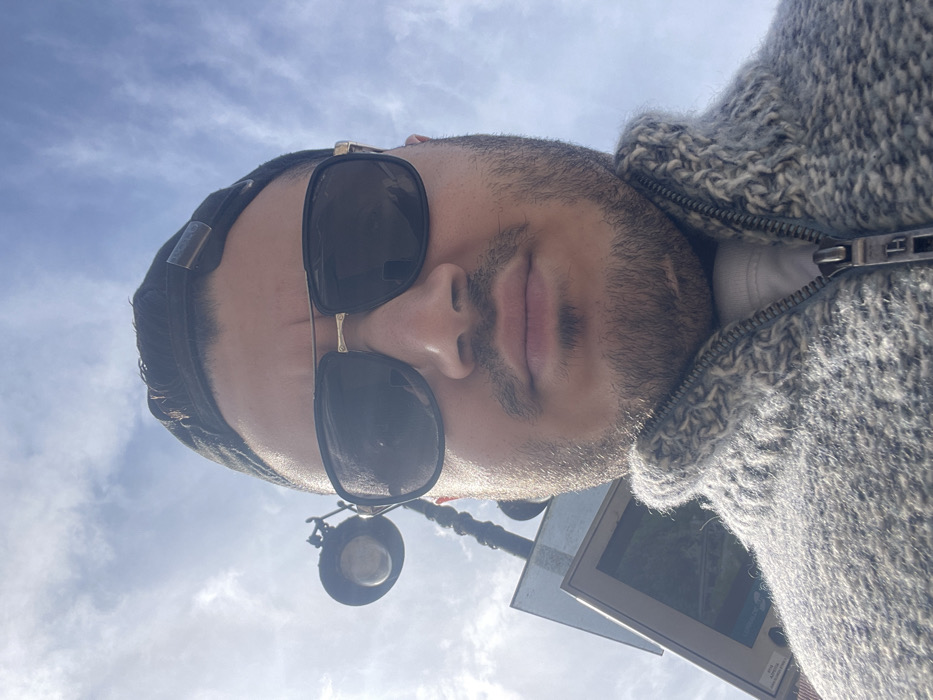 A close-up, low-angle portrait captures a male individual with dark hair, short facial hair consisting of a beard and mustache, looking directly forward. He wears dark aviator-style sunglasses with gold-colored bridge and frame accents. A dark baseball cap is worn reversed on his head. He is dressed in a light grey, textured, full-zip sweater, unzipped to reveal a white undershirt. The silver-toned zipper pull features a distinct "H" insignia. In the background, under a bright blue sky with scattered white clouds, an ornate dark-colored lamppost with a single round light fixture is visible on the left. Below the lamppost, a light-colored rectangular structure supports what appears to be an information kiosk or sign with a brown frame, displaying a scenic image and partially visible text. The scene is located in Azpeitia, Spain.