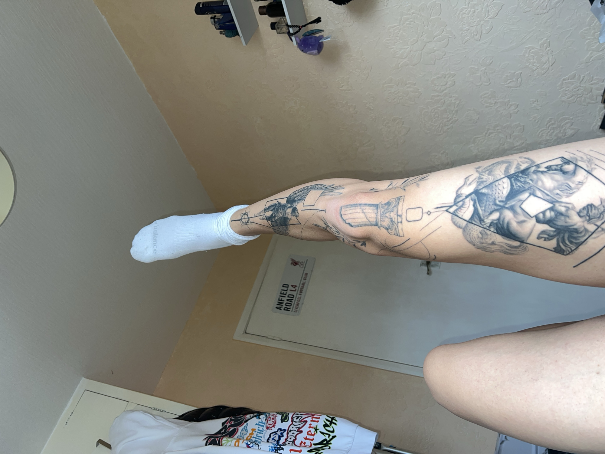 person's leg with multiple tattoos. The leg is positioned in front of a white door with a sign reading "ANFIELD ROAD L4 LIVERPOOL FOOTBALL CLUB." The person is wearing a white sock. The location is not specified as Bristol, United Kingdom. The environment consists of a room with a patterned wall, a partially visible white garment, and some shelves with objects on them.