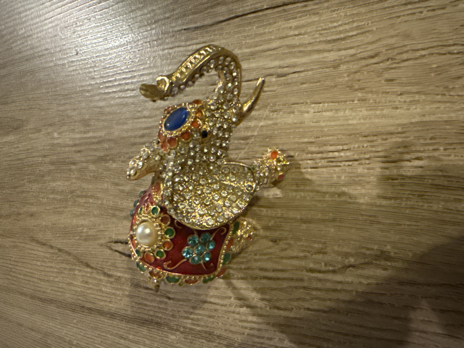 - "An ornamental elephant brooch rests on a light to medium brown wooden surface, exhibiting vertical grain patterns" by FM-o3Fqy2, licensed under CC BY 4.0