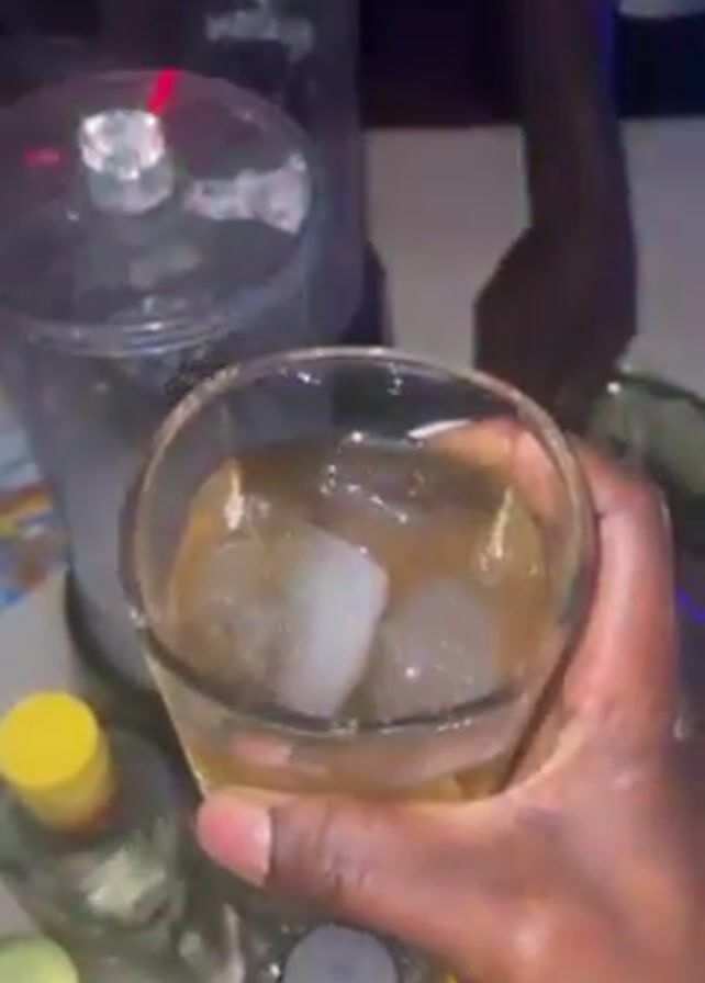A person's hand holds a glass with ice and a brown liquid, possibly whiskey, and adds a slice of lime. The scene is illuminated with blue light. Several bottles of liquor and a carton of pineapple juice surround the glass on a surface. A blender sits nearby, likely used to prepare the drink. The person's hand is dark-skinned. The scene suggests the preparation of a cocktail.