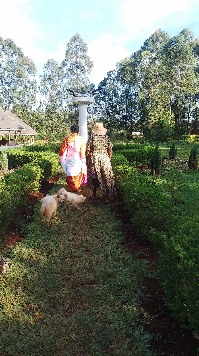This image captures an outdoor scene in a well-maintained park or garden within Kisa Central ward, Kenya, under natural daylight with a partly cloudy sky. Two individuals are seen from behind, walking away from the viewer along a narrow, unpaved grassy path. The person on the left wears a multi-colored garment primarily orange and white. The person on the right wears a dark, patterned long dress and a wide-brimmed, light-colored hat, carrying a dark bag on their left side. In the foreground, two light-colored, medium-sized dogs are present near the path. One dog with shaggy, light brown fur stands on the left of the path, looking towards the right. The second dog, slightly smaller and also light-furred, is crouched or lying on the path, facing away from the first dog. A prominent feature in the midground is a tall, white cylindrical pole topped with a multi-armed fixture, potentially a street light or decorative element. To the far left, a round gazebo-like structure with a conical thatched roof and wooden pillars is visible amidst green foliage. The background is characterized by a dense line of tall, slender trees, likely eucalyptus, rising against the sky. The landscape includes manicured green hedges bordering the grassy path, interspersed with other shrubs and dark soil patches.