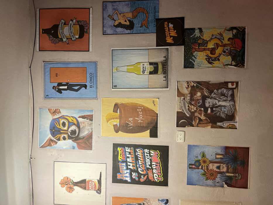 An interior wall in San Andrés Cholula, Mexico, is presented, covered with eleven distinct rectangular artworks and one circular sticker. The wall is a uniform light grey. A black electrical cable runs horizontally near the top edge, and a white duplex electrical outlet is affixed to the wall in the lower-middle left section. The artworks are arranged in three horizontal rows, with one circular item adjacent to the middle row. * **Top Row (Left to Right):** 1. A vertical print featuring a brown "Carta Blanca" beer bottle with an open cap, from which orange flowers emerge. 2. A vertical print depicting a chihuahua wearing a blue and yellow Lucha Libre mask and a red garment. 3. A vertical print styled as a Lotería card, numbered '5', labeled "EL CHICO," showing a silhouetted man in a suit and sunglasses leaning against an orange door numbered '512'. 4. A vertical print illustrating a brown beer bottle encircled by flowers, with the text "PREFIERO CAGUAMAS QUE TUS DRAMAS." * **Middle Row (Left to Right):** 5. A vertical black print with stylized, multi-colored Spanish text: "AQUÍ TODO SE HACE con Cariño Y PURITA PASIÓN." 6. A vertical print showing a brown, wide-mouthed clay pot with a lemon slice on its rim, containing a beverage, and the text "¡Viva México!" 7. A vertical print styled as a Lotería card, numbered '8', labeled "LA BOTELLA," featuring a yellow "Corona Extra" beer bottle with a lime wedge. 8. A vertical print styled as a Lotería card, numbered '51', labeled "LA BORRACHA," depicting a mermaid with an orange tail drinking from a bottle. 9. A circular black sticker or sign to the right of artwork 8, bearing orange text "MEZCALITA MIA." * **Bottom Row (Left to Right):** 10. A vertical print with a blue hue, showing a tequila bottle, two shot glasses containing tequila with lime, and agave plants, surrounded by orange and yellow flowers. 11. A vertical sepia-toned print depicting a man in a wide-brimmed hat holding a bottle, seated at a table, with three skeletal figures playing musical instruments in the background. 12. A vertical colorful print featuring abstract figures, possibly pre-Hispanic or folk art inspired, including a central figure surrounded by rabbits and other elements, against a background suggesting a sun and sky.