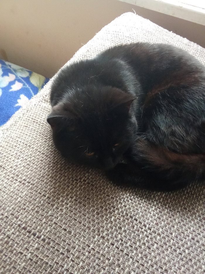 - "An image taken inside a building in Yarun, Ukraine, depicts a single black domestic feline curled up on a textured, light brown upholstered surface, likely a cushion or furniture" by FM-ULG7s2, licensed under CC BY 4.0
