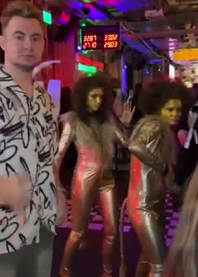 man in a patterned shirt posing at a party or nightclub. There are two performers in full costume and makeup standing to his right. They are wearing silver catsuits and animal makeup, and they are performing dance moves. The club is lit with colorful lights, and a digital display hangs from the ceiling. There are several other people in the background. The man posing gives a thumbs up and flashes a "hang loose" sign.