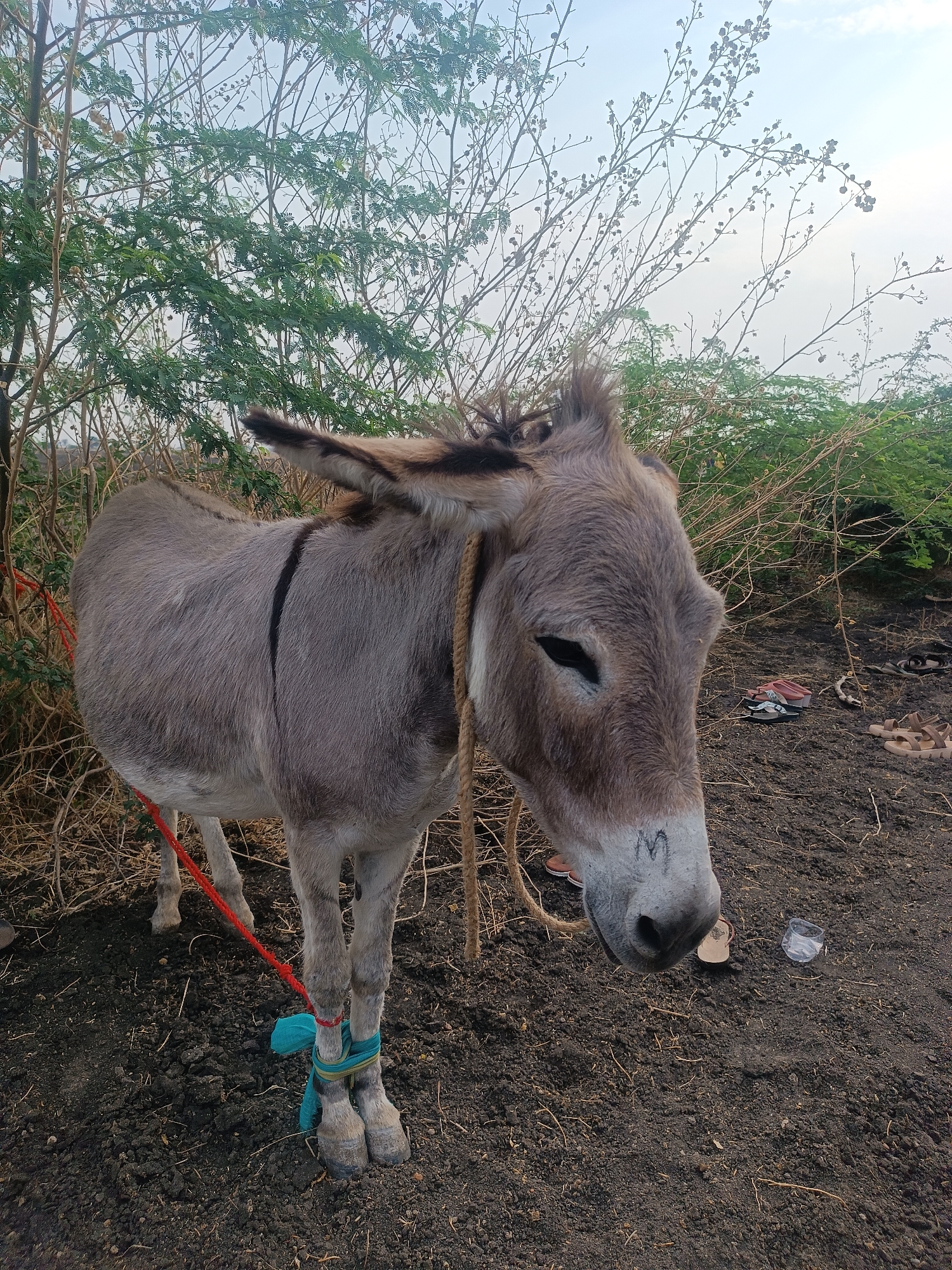The scene is set in Kottalapalli, India. A grey-brown donkey stands on dark, loose soil with sparse dry vegetation. The donkey's head is lowered and slightly turned to the right, exhibiting a lighter muzzle with a faint "M" mark. A dark stripe runs along its back. Its ears are upright. A light brown rope is visible around its neck. A red rope is tied to its left front leg, extending to the left out of frame. Both front fetlocks are bound together with a blue and green fabric or rope, restricting movement. In the background, dense, dry-looking scrub and bushes with some green foliage are visible. The sky is bright and overcast. On the ground to the donkey's right, several items of footwear are scattered, including a pair of dark flip-flops, a pair of reddish-brown sandals, and a pair of light brown sandals. A clear plastic cup and a light-colored plastic container are also present on the ground.