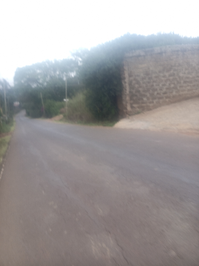 The image depicts a rural or semi-urban roadway in Ewuaso Oonkidong'i ward, Kenya, under an overcast sky. The primary subject is an asphalt or paved road, appearing dark grey with visible cracks and lighter patches indicative of wear or uneven surface. The road extends from the foreground into the distance, curving gently to the left. Along the immediate left edge of the road, a narrow strip of light green vegetation is present. To the right of the road, a significant stone wall, constructed from light-colored, irregularly cut stones, forms a prominent boundary. The wall's top edge is densely covered with dark green foliage, suggesting overgrown vegetation or a hedge. Adjacent to the left side of this stone wall, a cluster of dark green bushes or trees is visible. Further along the road's trajectory, dense green vegetation, primarily trees and bushes, lines both sides of the thoroughfare. A faint, slender vertical object, consistent with a utility pole or tree trunk, can be discerned amidst the foliage on the left side of the road further into the distance. The sky, occupying the upper portion of the frame, is bright white to light grey, indicating an overcast condition with diffused lighting. No distinct individuals, animals, or vehicles are visible within the frame. The overall image exhibits a soft focus, rendering specific details indistinct.