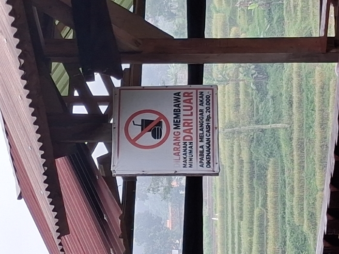 A sign, partially obscured by a wooden structure, displays a red circle with a diagonal line through it, superimposed over an image of a beverage. Bold, capitalized text warns against bringing food and drinks from outside. It further states that violating this rule will result in a cash fine of Rp. 20,000. A background of dense green foliage adds context to the location.