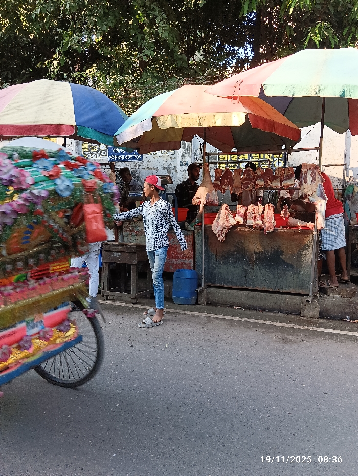 A bustling street scene unfolds with vendors selling meat under colorful umbrellas. A young man in a patterned shirt and red cap stands near the stall, while a rickshaw adorned with vibrant flowers passes by. Other vendors are seen in the background. The setting is a typical urban marketplace, full of activity and local commerce. The date 19/11/2025 is visible in the lower right corner.