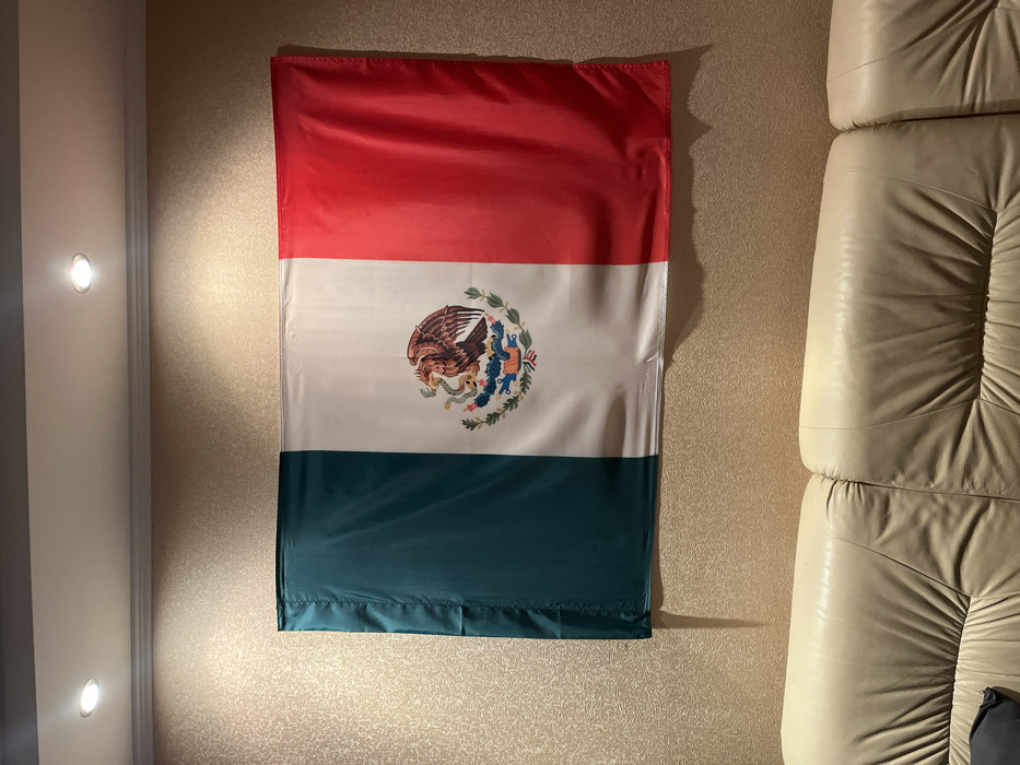The image depicts an indoor setting within the city of Engels, Russia. A Mexican national flag is centrally mounted on a light-colored, textured wall. The flag displays vertical green, white, and red stripes from left to right, with the national coat of arms—an eagle perched on a prickly pear cactus devouring a snake—centered on the white stripe. The flag fabric appears synthetic and exhibits minor creasing. Two recessed ceiling spotlights are visible above the flag, illuminating it and the wall. The upper portion of a light-colored, multi-cushioned leather sofa occupies the lower foreground, with a dark pillow partially visible on its left side. No individuals, actions, or interactions are depicted within the scene.