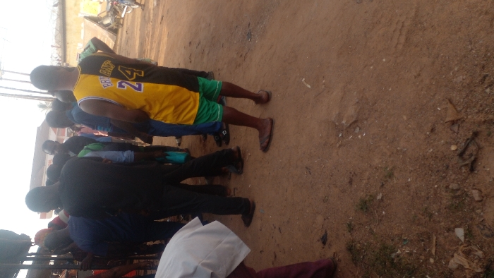 A group of people stand together on a dirt road. The individual in the forefront wears a Kobe Bryant jersey with the number 24. Most others are dressed in dark clothing. The ground is dirt and gravel, with sparse vegetation. A building can be seen in the background.