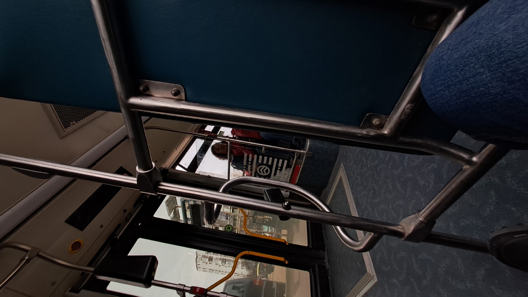 The image displays the interior of a public transit bus, viewed from a low angle, likely from a seated passenger's perspective, with a portion of a leg in blue jeans visible in the lower right foreground