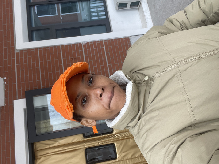 A single individual is depicted outdoors in Daxing District, China, positioned in front of a brick building. The person, an adult with medium-dark skin, wears an orange baseball cap with a distressed brim and a light beige or khaki puffer jacket with a visible white sherpa lining at the collar. The jacket is partially zipped. The individual faces the camera directly with a neutral expression, lips slightly pursed. The background features a red brick wall with white architectural trim. To the left of the individual is a dark-framed glass door, partially obscured by a golden, vertically ribbed, padded covering containing two rectangular dark-framed sections. To the right, a dark-framed window is visible, reflecting external structures. Below this window, a white outdoor air conditioning unit is mounted on a light-colored ledge. The ground surface in the foreground appears light-colored.