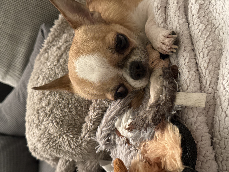 A tan and white chihuahua rests on a fluffy, gray cushion. The dog's large, dark eyes gaze upward. It holds a tattered, stuffed toy squirrel in its paws and mouth. The toy is a mix of brown, gray, and tan colors, and a partially visible tag is attached. A soft, light gray blanket is in the background. Part of a dark gray couch is seen to the left.