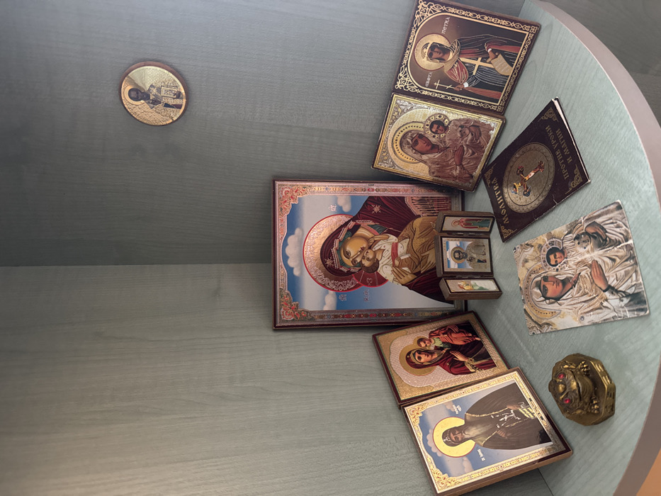 The image displays a collection of religious artifacts and a figurine arranged on a light teal-colored corner shelf, likely located in a private residence in Vidin, Bulgaria