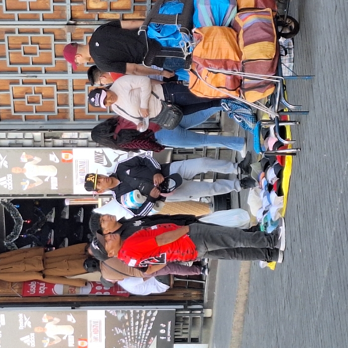 A group of people stand along a sidewalk next to a building with advertisements for athletic shoes. One person is selling hats from a yellow cloth. Several individuals wear baseball caps. There's a cart filled with large bags. People are dressed in various colors including red, black, brown, and white. The scene has an urban street market feel. The image is oriented vertically.