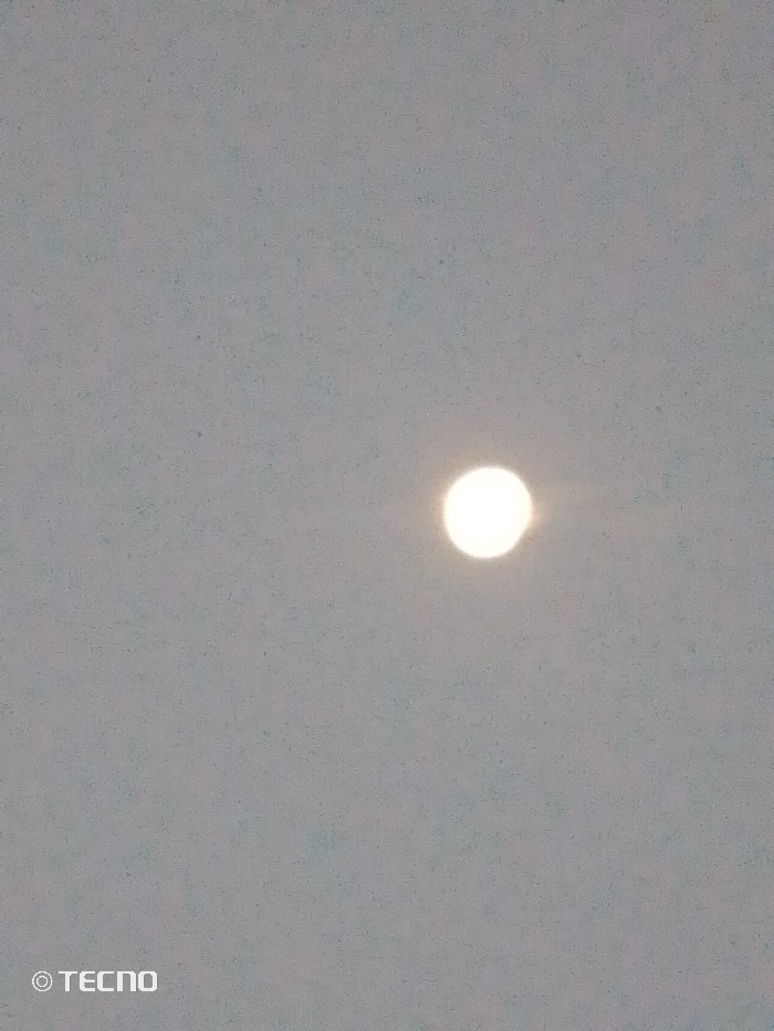 The image depicts a bright, circular light source, likely the sun, centrally positioned against an expanse of hazy, light grey-blue sky over Adankolo, Nigeria. The sky appears uniform and lacks distinct cloud formations, exhibiting a fine, granular texture. No other celestial bodies, terrestrial features, people, or objects are visible within the frame, which is dominated by the sky and the luminous sphere. A "© TECNO" watermark is present in the lower-left corner of the image.