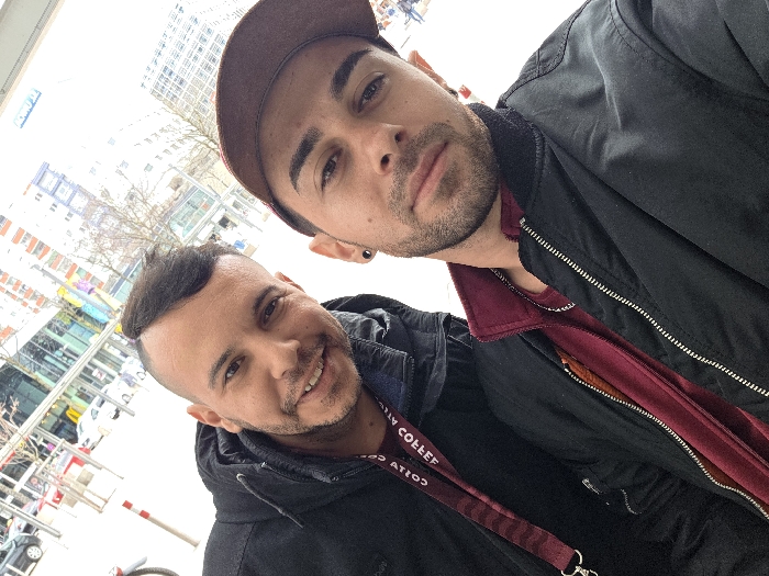 Two adult males are depicted in a close-up selfie in an urban environment within the city of Unknown, Unknown