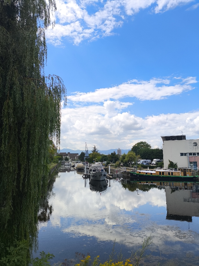 The image depicts a static outdoor scene along a canal, identified as the Port de Colmar area in Colmar, France. The left side of the foreground is dominated by a large weeping willow tree, its long, green branches extending towards the water. The central and lower portions of the frame are occupied by the calm canal water, which distinctly reflects the blue sky, white clouds, and elements along the banks. Along the right bank, several vessels are moored. In the mid-ground, a grey motor yacht with a visible cabin is prominently docked to a pier structure. To its right and slightly forward, a long, dark green or black barge-like vessel with a light brown superstructure is also moored. Further along the right bank, a light-colored, multi-story building with a flat roof and a prominent circular window on its side is visible. Beyond this, an area containing parked recreational vehicles (RVs) is discernible. The left bank, extending past the willow tree, features a line of trees and various buildings. In the background, a large grey gantry crane is visible, indicative of an industrial port environment. Distant hills or mountains are visible under the horizon. The sky is clear blue with numerous scattered white cumulus clouds, which are mirrored in the water's surface. No individuals are present, and no actions or interactions are depicted.