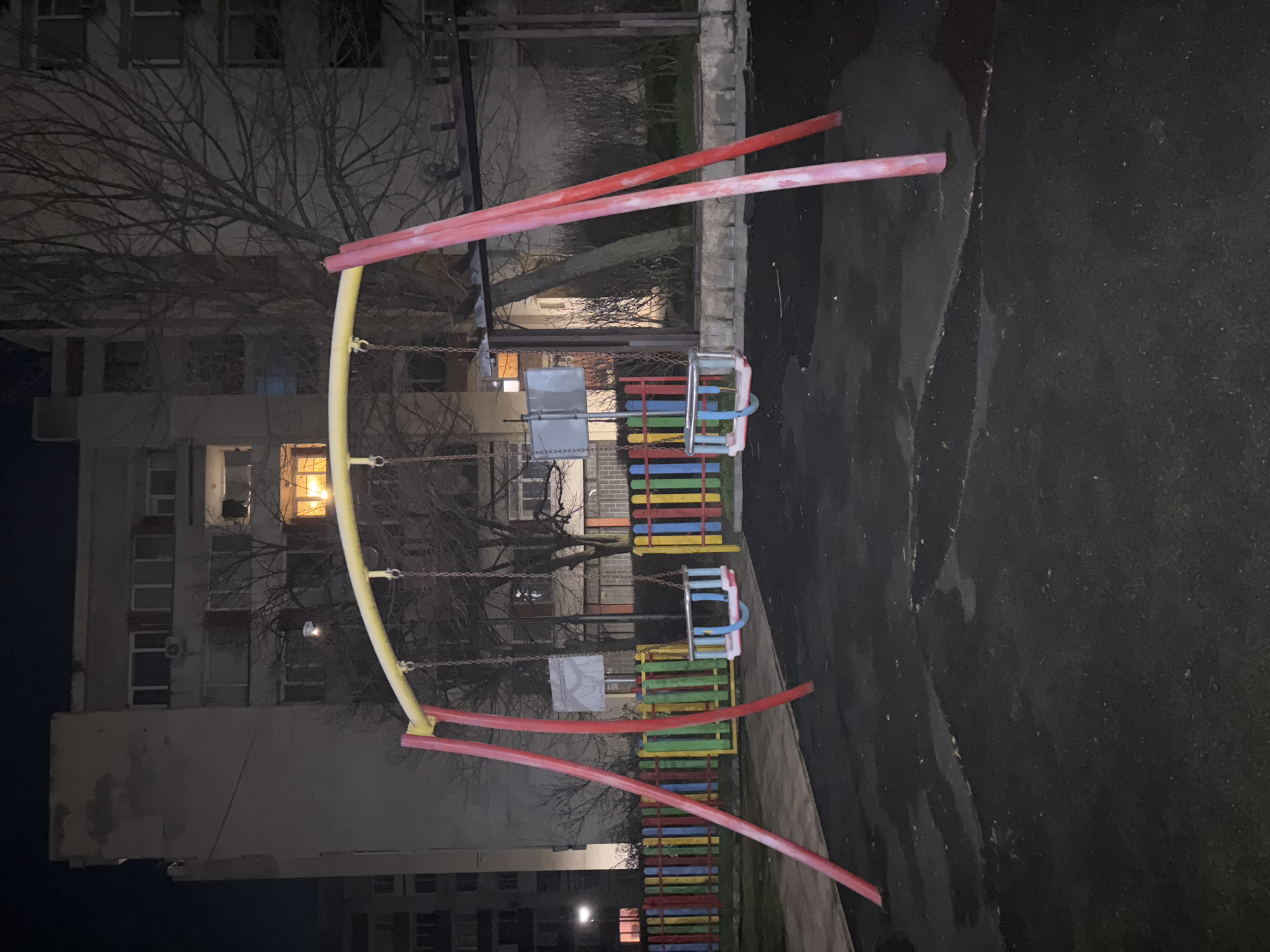 The image depicts an unoccupied children's playground at night in Razgrad, Bulgaria. In the foreground, a metal swing set features a yellow horizontal beam supported by two pairs of red, weathered vertical poles. Two child-sized bucket swings, one predominantly blue and the other with white and blue elements, hang from chains. The ground beneath the swings is covered with a dark, possibly rubberized, surfacing, exhibiting some damp patches. Behind the swing set, a low, colorful fence constructed of vertical wooden slats painted in red, yellow, green, and blue separates the playground from the surrounding area. Beyond the fence, several deciduous trees with bare branches are visible, indicating a cold season. In the background, multiple-story residential buildings with light-colored facades rise against a dark night sky. Some windows are illuminated, notably one on an upper floor of the rightmost building emitting a distinct orange light, and another on a lower floor of a building to the left showing a faint red light. An air conditioning unit is mounted on one building facade. No individuals or animals are present in the scene.