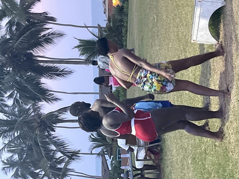 This image captures an outdoor scene on a grassy area under numerous palm trees, set against a backdrop of the ocean and a light blue to light purple sky, indicating a coastal location in Kasoa, Ghana