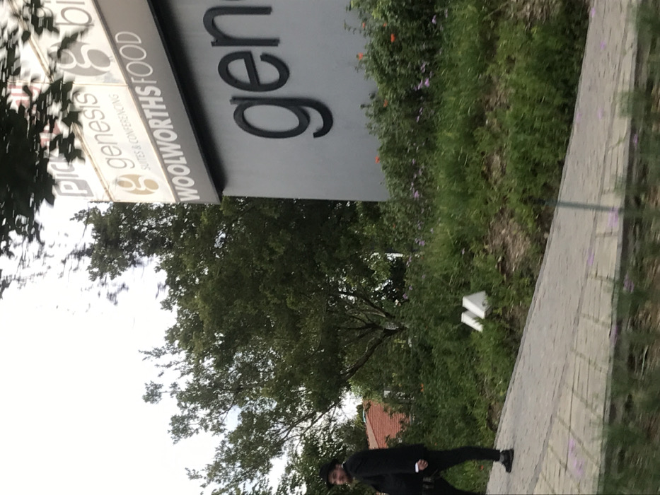 A sideways view shows a tall sign displaying "Genesis" and "Woolworths Food