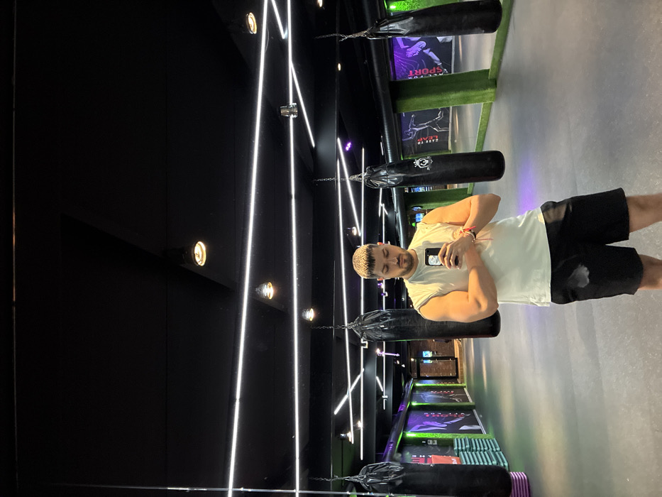 A male individual is captured in a mirror selfie within the "Base to Leaf" gym in Sofia, Bulgaria. He stands centrally, holding a dark-colored smartphone with both hands at chest level, looking down at the screen. He is wearing a light-colored sleeveless t-shirt and black athletic shorts, which have a visible sweat stain on the front. A red bracelet adorns his right wrist. The gym features a dark aesthetic with a black ceiling and floor. Linear white LED lights crisscross the ceiling, augmented by several circular spotlights. Numerous black punching bags, suspended by chains, are visible throughout the space. One bag behind the subject prominently displays a white "BASE TO LEAF" logo. The walls are a mix of mirrored surfaces, sections covered in artificial green turf, and graphic art illuminated by purple and green neon-style lighting depicting athletic figures. A stack of blue and purple step platforms is visible on the far left, and a brick-patterned wall section is in the background center.