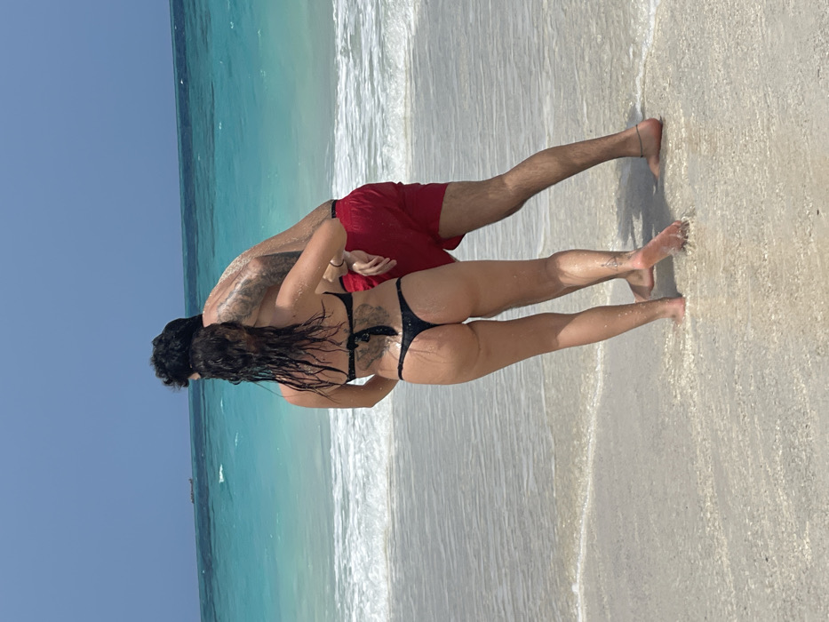 On a sunlit sandy beach in Zanzibar, Tanzania, a female and a male stand in shallow turquoise ocean water, facing away from the viewer towards the horizon. The female, with dark, wet hair, wears a black thong-style bikini, revealing a butterfly-like tattoo on her upper back and a geometric symbol tattoo on her left ankle. The male, with dark, curly hair and visible arm and shoulder tattoos, wears red swim shorts. His left arm is around the female's waist. Both individuals are barefoot, with small waves breaking around their ankles. The clear sky above is light blue, and a faint silhouette of a boat is visible on the distant ocean horizon.