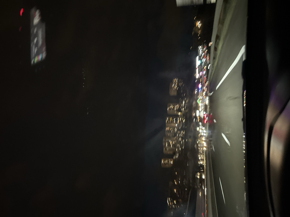 A nighttime view from inside a vehicle, showing a blurred cityscape illuminated with numerous lights