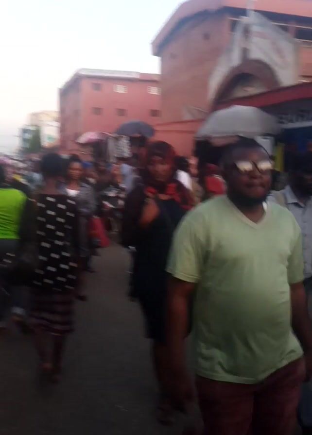 crowded street market scene, likely in an urban environment. People are moving around, seemingly shopping or going about their business. There is a parked truck partially visible in the frame. Baskets and bundles of green leafy vegetables are visible near the truck. The camera moves slightly, showing different areas of the market.
