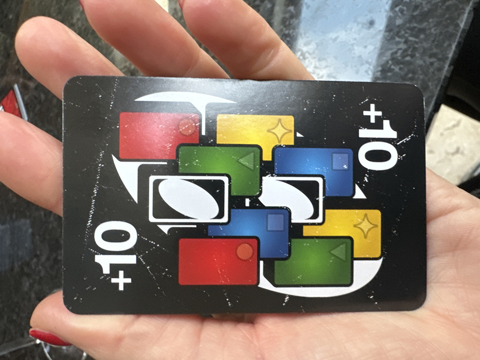 A human left hand with red nail polish on the thumb holds an Uno All Wild "Wild Draw 10" playing card