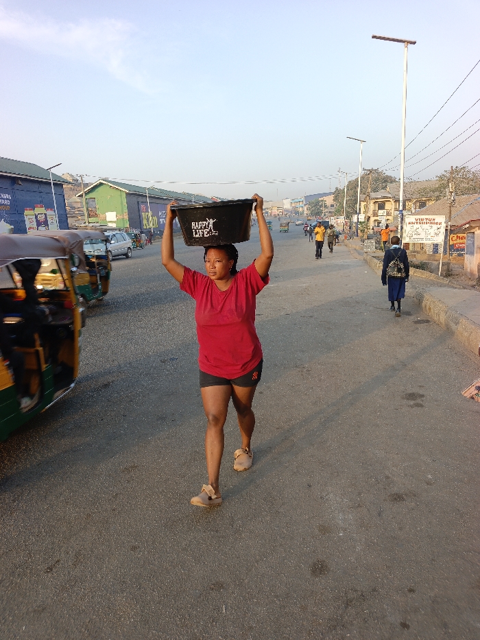 A woman in a red shirt and black shorts carries a black bucket labeled "HAPPY LIFE" on her head