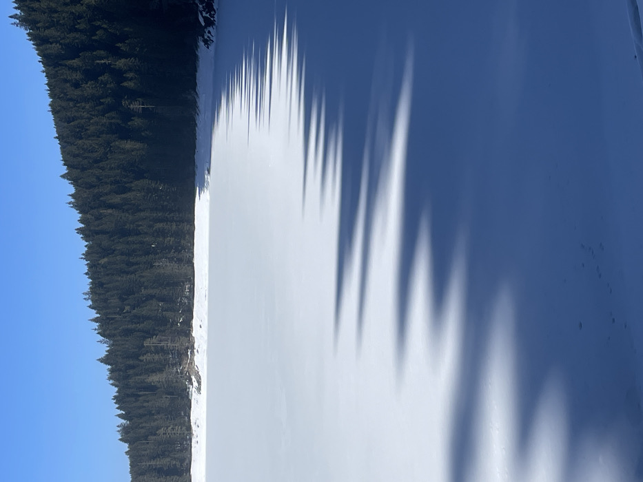 The image displays a winter landscape in Pitomine, Montenegro. The scene is dominated by a flat, white expanse of snow covering a frozen body of water or a large open area. In the background, a dense coniferous forest with numerous dark green trees covers a hillside, meeting the snow-covered surface at an irregular, snow-lined bank. Above the tree line, a clear, light blue sky is visible. Long, dark, parallel shadows are cast across the snow from an unseen source to the left, creating a striped pattern that extends from the mid-right edge towards the lower-left foreground. These shadows are dark blue-grey against the brighter white snow. No individuals, animals, or man-made structures are distinctly present in the visible area. The environment is brightly lit by the sun, suggesting clear weather conditions.