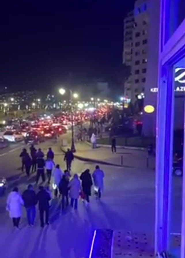nighttime street scene with heavy traffic and many pedestrians. The camera appears to be positioned from a slightly elevated location, perhaps a balcony or window. Below, a wide street is filled with cars, their headlights creating a dense and seemingly slow-moving traffic jam. Pedestrians are walking on the sidewalks and also crossing the street. They are dressed in casual clothing and mostly walk in groups. The street is lit by streetlights that cast a bright glow. A body of water can be seen in the background, with lights from a city visible across the water. The building from which the video is being filmed has a blue neon light. Car horns can be heard in the background.