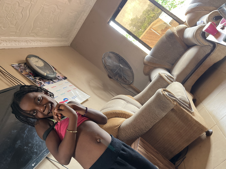 A young girl smiles at the camera wearing a pink top and black pants. She has bracelets on her wrists. Behind her, a television sits to the left and a wall with a clock and calendar dated 2024. An electric fan stands near a large, beige upholstered armchair and sofa set positioned by a window. The ceiling has a decorative, textured pattern.