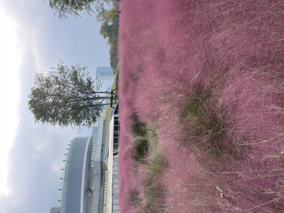 The scene captures an urban park landscape in Jinshui District, China, under an overcast sky. The foreground is dominated by an extensive field of vibrant pink-flowering grass (Muhlenbergia capillaris), with occasional patches of green foliage. In the mid-ground, a low, white building with horizontal windows is partially integrated into a green, ascending slope. Behind this, a large, modern building with a curved, glass-paneled facade and a flat roof with equidistant vertical fin structures is visible. To the right of this primary building, a cluster of two deciduous trees with green leaves stands, under which a dark green metal swing set is discernable. The background reveals a city skyline featuring multiple high-rise structures, including a tall, slender skyscraper on the right. Several individuals are present: one person is visible through a window of the lower white building, and multiple smaller figures are scattered within the pink grass field and on the distant green slopes, one of whom wears a red top. The overall environment suggests a publicly accessible recreational area.