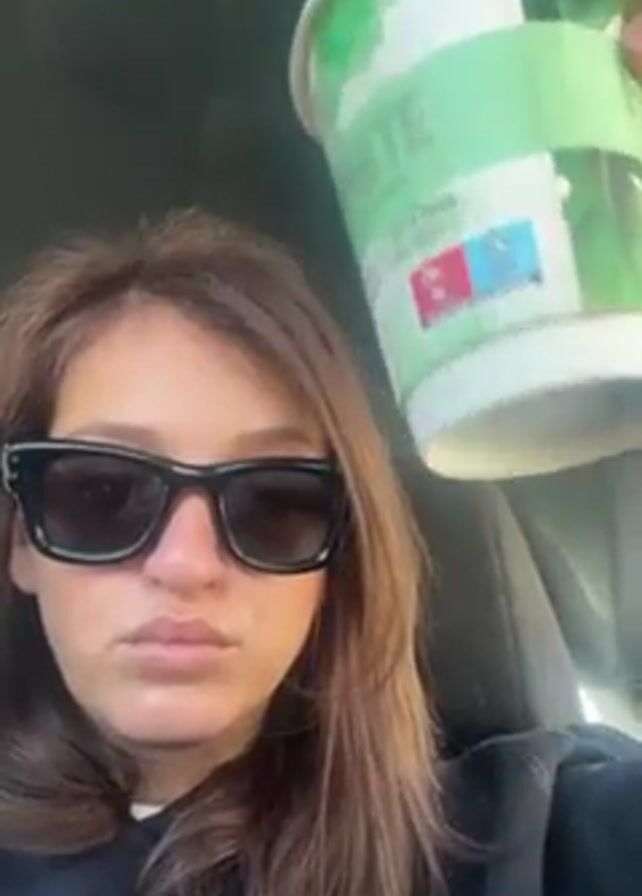 A woman wearing sunglasses is sitting in a car and shaking a cup over her head. The cup is white with a green design. The woman has brown hair. She is wearing a black sweatshirt with white writing on it. The car seat is dark. The inside of the car is visible in the background.