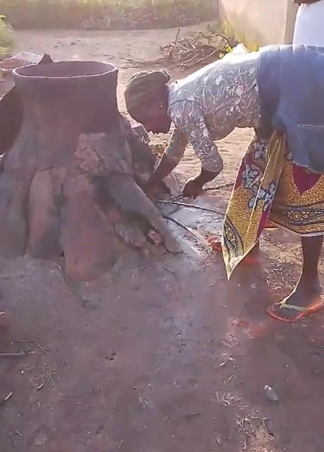 A woman is tending to a fire in an outdoor setting. She is bent over, placing pieces of wood into a fire pit. The fire pit is made of stone or brick and appears to be for cooking. A large metal pot rests on top of the fire pit. The woman is wearing a head covering, a patterned shirt, and a colorful skirt with a denim wrap. She is also wearing orange and green flip-flops. Another person, partially visible and wearing a white shirt, stands nearby. The ground is dirt and there is a building in the background. The scene is lit by sunlight.